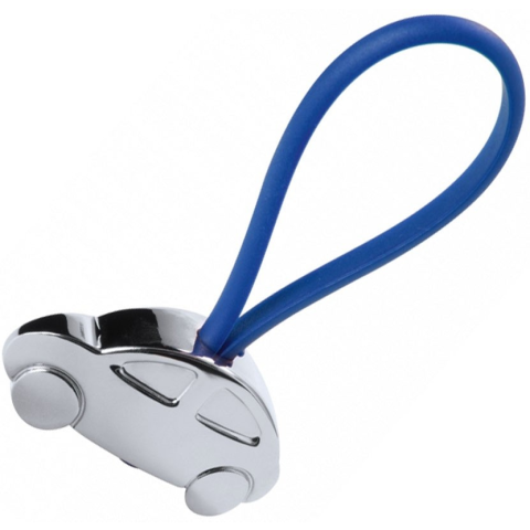 Fényes ezüst színű fém kulcstartó, színes gumi hurokkal, celofán tasakban.
