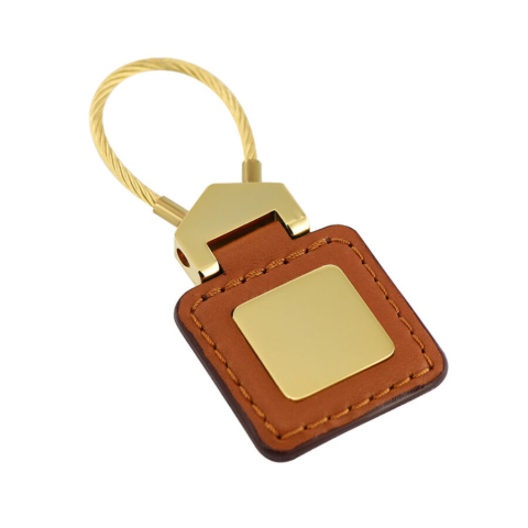 Fém kulcstartó újrahasznosított PU bőr betéttel.