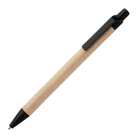 Karton golyóstoll műanyag klipsszel és fekete színű kiegészítőkkel.