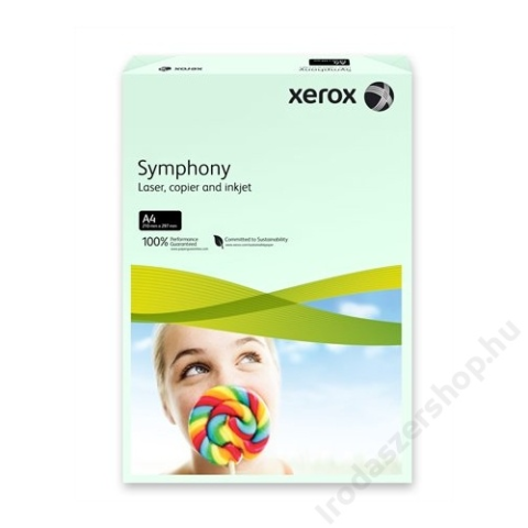 Másolópapír, színes, A4, 160 g, XEROX Symphony, világoszöld (pasztell) (LX92836) - kiváló minőség - kétoldalas másolásra is alkalmas - anyagában színezett másolópapír - sima felület - felhasználható fénymásoláshoz, tintasugaras és lézernyomtatókho