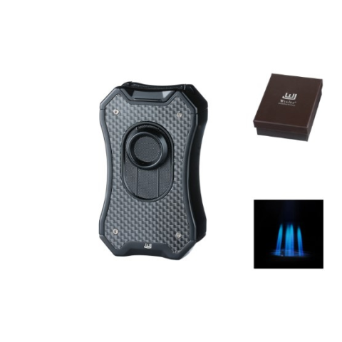 Fekete színű karbon mintás Winjet márkájú asztali szivargyújtó. Erős 4-es szúró láng, masszív fém ház jellemzi, a könnyebb kezelhetőség miatt pedig egy nagy méretű nyomógombbal van ellátva. Egy zárófedél védi a szennyeződéstől a fúvókákat, de ez a fedél akár szivartartóként is használható. Az alján után tölthető öngyújtó töltő gázzal és az állító kerékkel a láng mérete is itt szabályozható. Egy igazán férfias szivar öngy