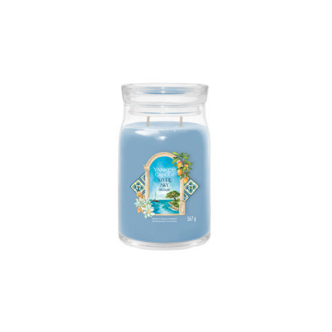 Gyertya - illatos, mindennapi használatra való, gyümölcsös illat, 2 kanóccal, üvegedény, kerek alakú, anyaga szójaviasz és paraffin, kék kivitel, égési idő 90 óra A YANKEE CANDLE Azure Sky illatgyertya az óceán frissességét és az egzotikus gyümölcsök illatát hozza el otthonodba. A kompozíciót lédús narancs, mangó és ananász nyitja frissítő tónusokkal, míg a szí