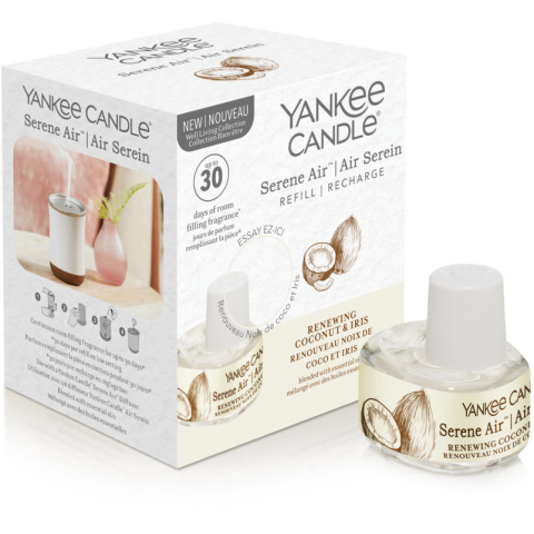 Diffúzor utántöltő - kókusz és írisz aroma, űrtartalma 17 ml Yankee Candle Serene Renewing Coconut & Iris 17 ml is a replacement fragrance cartridge for the Serene Air diffuser that will scent your interior for up to 30 days. Simply insert it into the base of t