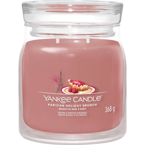 Gyertya - illatos, mindennapi használatra való, gyümölcsös illat, 2 kanóccal, üvegedény, kerek alakú, anyaga szójaviasz, rózsaszín kivitel, égési idő 90 óra YANKEE CANDLE Signature Parisian Holiday Brunch 368 g, 2 kanóc legfontosabb jellemzői Az illatos YANKEE CANDLE gyertya kellemes beltéri légkört varázsol Üvegtégelyben szerezhető be, amely kellemes han
