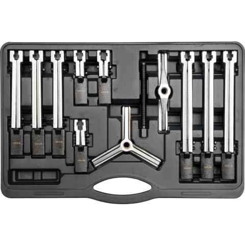 Professzionális készlet nagy csapágyak, csigák és fogaskerekek húzásához. A készlet elemei lehetővé teszik a következő lehúzók összeállítását: kétkarú, 100/200 és 250 mm hosszúságú karokkal, belső és külső kivitelben, valamint háromkarú lehúzók - 100/
