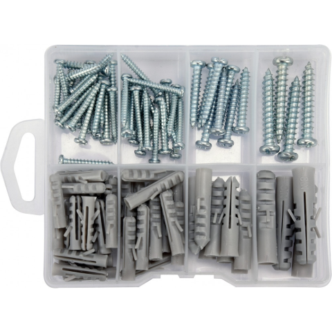 YATO YT-36504 márkájú csavarok és dugók készlete. Kiváló minőségű anyagokból készült. A méretek széles választéka biztosítja a terhelésnek, a rögzítési módnak és a felületnek megfelelő elemek kiválasztását. A könnyű szétválasztás érdekében rekeszekkel