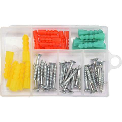 YATO YT-36505 márkájú csavarok és dugók készlete. Kiváló minőségű anyagokból készült. A méretek széles választéka biztosítja a terhelésnek, a rögzítési módnak és a felületnek megfelelő elemek kiválasztását. A könnyű szétválasztás érdekében rekeszekkel