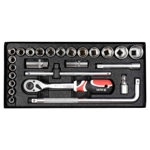 YATO Dugókulcs készlet 25 részes 1/2 10-32 mm CrV • 1/2” (12.7 mm): 10, 11, 12, 13, 14, 15, 16, 17, 18, 19, 20, 21, 22, 23, 24 mm(L=38 mm) 27, 30, 32 mm (L=42 mm) • 1/2” (12.7 mm) (127 mm) CrV 50BV30 • 1/2” (12.7 mm): 16, 21 mm CrV 50BV30 • 1/2” (12.7