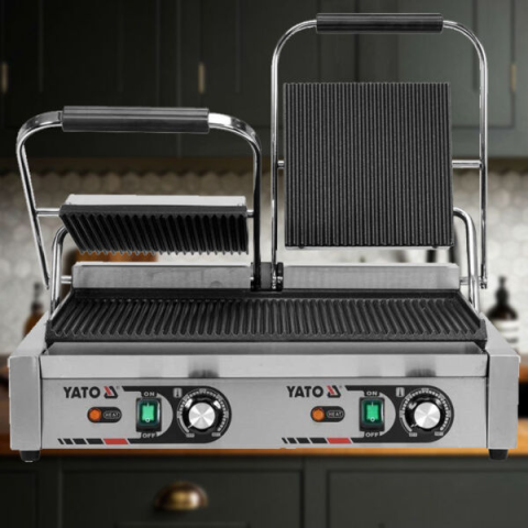 YATO YG-04560 típusú kétzónás kontaktgrill, 3,6 kW teljesítménnyel. A YATO grill minden konyhában nélkülözhetetlen eszköz. Gyorsan elkészíthető vele hamburgerek, húsok, halak, tortillák, pirítósok, paninik vagy zöldségek. Az eszköz bordázott öntöttvas