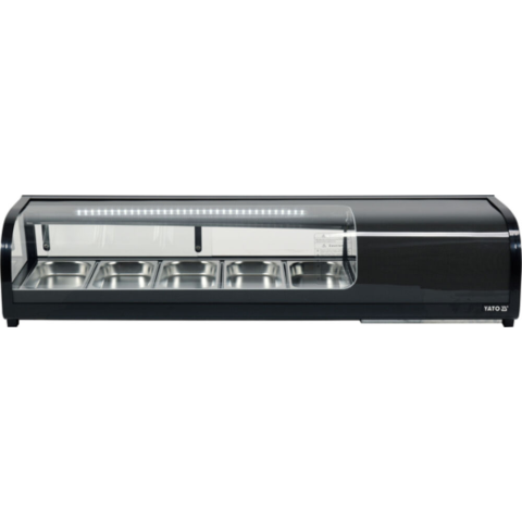 YATO hűtő 5x1 / 3GN edényekhez A YATO hűtő főként sushi, tapas és különféle előételek tárolására tervezték. A modern design és a kiváló minőségű nyersanyagok teszik a YATO hűtőt tökéletessé. Ezenkívül a négy oldalon lévő beépített LED-es világítás nagyon