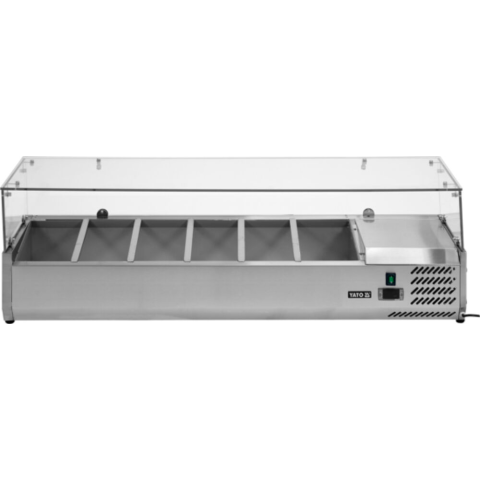 A YATO YG-05321 típusú Superior 6x1/4 GN hűtött vitrines bemutató állvány. A YATO márka hűtött vitrines bemutató állványa biztosítja az ételek elkészítéséhez szükséges alapanyagok megfelelő hőmérsékletét: pizzák, saláták, szendvicsek stb. A modern kia
