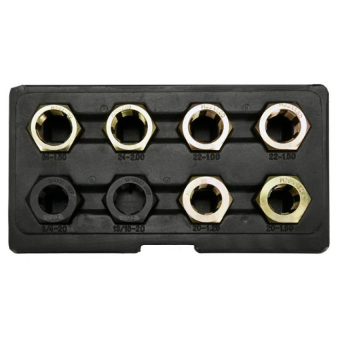 Menettípus: 3/4x20 UNEF, M20x1.5 mm Méret: 1-1/4 (32.0 mm) Anyag: szénacél Alkalmazás: sérült féltengelymenetek javítására Professzionális 8 darabos készlet sérült autómenetek javításához. • Anyaga: acél • Menetanya méretek: M24 x 1.5, M24 x 2, M22 x