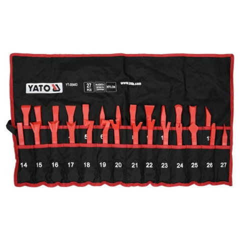 YATO kárpitkiszedő készlet – 27 db | Speciális profilokkal, hordtáskában A YATO YT-08443 egy 27 darabos professzionális kárpitbontó készlet, amelyet kifejezetten autók belső burkolatainak, kárpitcsatoknak, klipszeknek és díszítőelemeinek biztonságos eltá