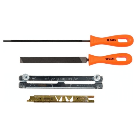 Kézi láncélező készlet, 4 részes, 0,325, Ø4,8 mm//Yato átmérő: 4.8 mmanyag: szerszámacélfogantyú: polipropilén25, 30 és 35 fokos szögben való élezésre tervezték