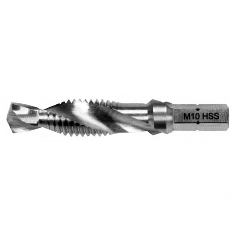 YATO Kombinált gépi fúró-menetfúró M10 bit befogású Yato YT-44847 csapfúró és menetvágó, amelyet precíz metrikus menetek vágására terveztek. Gépes és kézi menetvágásra egyaránt használható. kiváló minőségű HSS M2 gyorsacélból készült csiszolt felülete kiváló pontosságot és gyorsabb fúrási sebességet biztosít tartós és ellenálló a károsodás és az eltolódás ellen önközpontosító fúrófejek kiváló forgácseltávolítás 1/4" HEX tokmány Pa