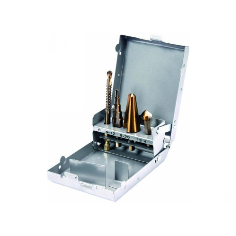 YATO Lépcsős fúró multi készlet 4 részes bit befogású • anyag: HSS 4241 szerszámacél • marófúrószár: 6 x 90 mm • lépcsős lemezfúró: 4-12 mm • lemezfúró: 8-20 mm • kúpos furatsüllyesztő: 12,4 mm