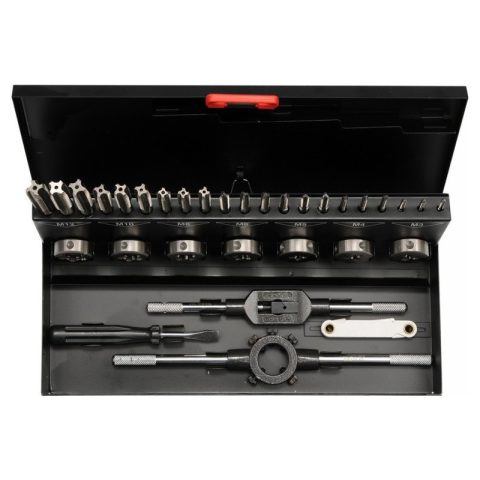 YATO Menetkészítő készlet: 32 részes HSS szerszámkészlet M3-M12-ig Ez a 32 részes YATO menetkészítő készlet minden szükséges szerszámot tartalmaz a belső és külső menet vágásához és javításához. Ideális barkácsolók és szakemberek számára egyaránt. A...