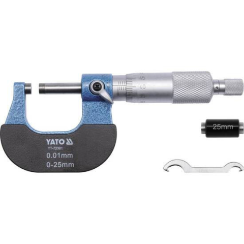 YATO professzionális mechanikus mikrométer az igazán pontos mérésekhez. Mérésnél először a rögzítő kart oldja fel. A mérendő tárgyat fogja körbe a pofákkal, majd szorítsa rá őket. Mérési eredmény elolvasása előtt rögzítő kart el kell fordítani. A nagyobb