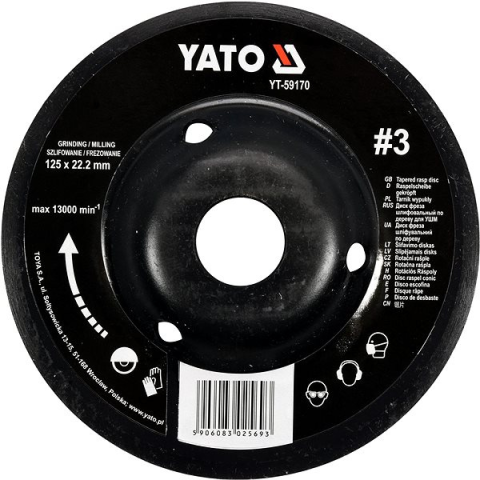Csiszolókorong fa és műanyag megmunkálásához - reszelő, 125 mm átmérő, 13000 ford/perc maximális sebesség, X-Lock rögzítés, 22,2 mm szerelőnyílás A kiváló YATO Rotációs ráspoly, finom, 125 mm, 3. típus fő jellemzői A strapabíró YATO csiszoló korong optimális anyagok csiszolásához és megmunkálásához Durva struktúrája lehetővé teszi a hatékony át