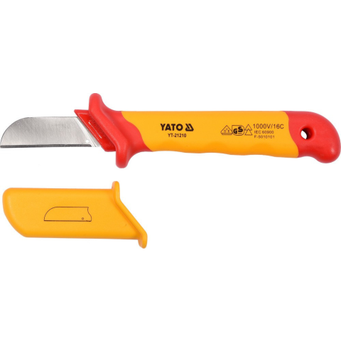 Termékleírás: 1000 V-ig szigetelt kés a YATO YT-21210 villanyszerelők számára. Tartós, CrV króm-vanádium acél szerszám. A többkomponensű VDE tanúsítvánnyal ellátott fogantyú 1000 V-ig terjedő szigetelést biztosít, így a szerszám alacsony feszültségű te