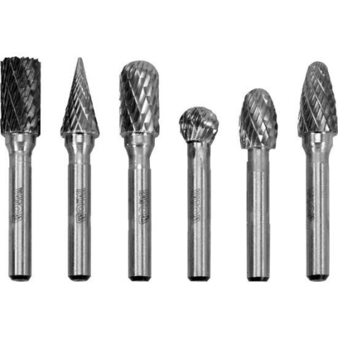 Volfrám-karbidból készült marók, melyeket tartósság és magas vágási sebesség jellemez. - 6 mm-es tartó a legtöbb pneumatikus csiszolóhoz és elektromos egyenes csiszolóhoz - átmérő: 10 mm - 6 különböző alakú vágót tartalmaz Alkalmazás: - az autóiparban é