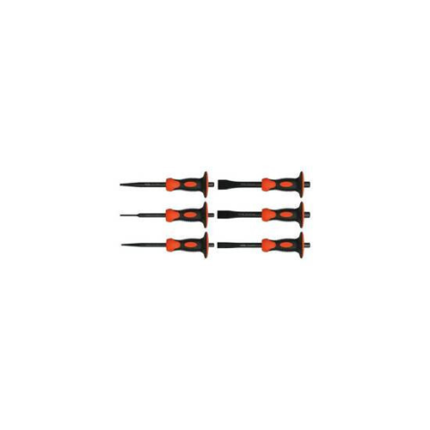 Lapos véső: 13 x 10 x 180 mm /16 x 13 x 180 mm /19 x 13 x 180 mm Hármas lyukasztó: 3 x 180 mm Kúpos lyukasztó: 3 x 180 mm Lyukasztó: 4 x 180 mm Fémmegmunkáláshoz. Vágáshoz, lyukasztáshoz és pontozáshoz. Anyaga: CrV acél