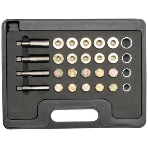 Yato olajteknő javító készlet. Sérült olajdugók javítására tervezték. A készlet négyféle szálra készült: M13, M15, M17, M20. Egyfokozatú HSS csapok, mindegyik méret 5 olajteknő dugót és 10 alátétet tartalmaz. Miután kivágta a fonalat az olajteknőbe, helye
