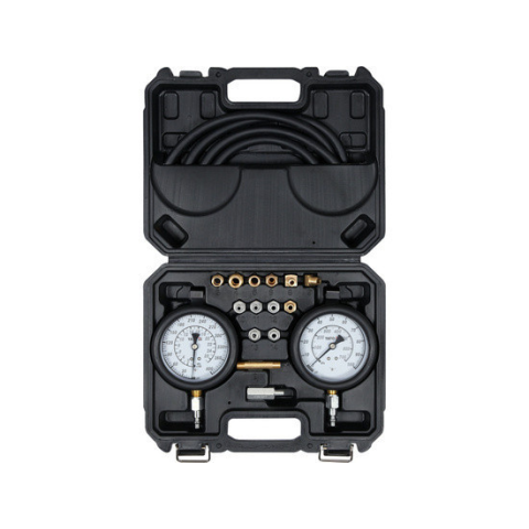 Motor és sebességváltó olajnyomásmérő készlet. 90 mm átmérőjű nyomásmérők (plusz gumiborítás). A készlet tartalma: - két nyomásmérő 0-400 PSI és 0-100 PSI beosztású - nagy nyomású rugalmas tömlő, 185 cm hosszú 1/8-27 NPT x 2 egyenes adapter 3/8-18 NPT a