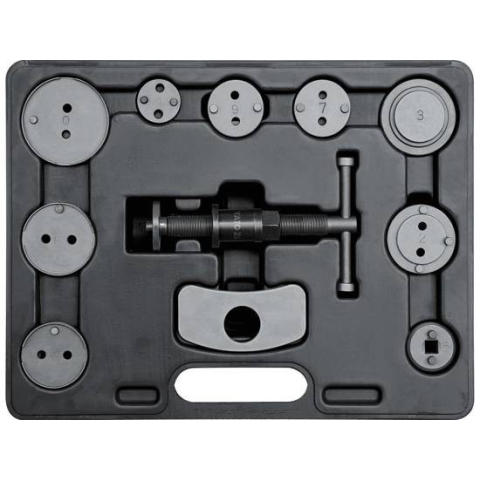 Professzionális készlet fékdugattyúk szétszereléséhez. A készülék egy jobb oldali csavarprésből és egy olyan lemezkészletből áll, amely lehetővé teszi a dugattyúk cseréjét az autók széles körében. A következő márkához ajánlott: Citroen: Xm, Xantia; Alfa