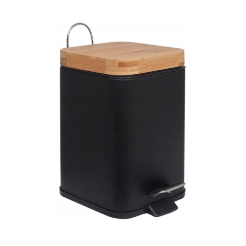 Yoka Home modern formatervezésű, esztétikus fürdőszobai mini szemetes. Porfesetett matt fekete rozsdamentes acél váz, bambuszfa fedővel. Pedálos nyitás, érintés nélkül. Vödrös belső tartállyal rendelkezik, így a szemetes tartalma a belső kisvödör kiemelés