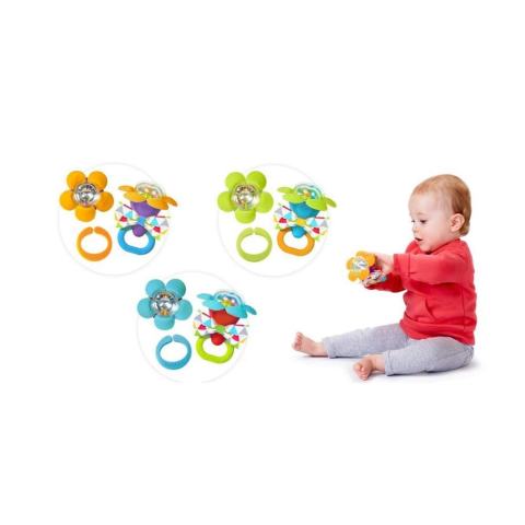 Színes, többfunkciós virág alakú csörgő. Színes gyöngyök csilingelnek és a szín átömlik a műanyag tokon. A fogantyú tökéletes a fájó íny rágásához. A termék tartalmaz egy műanyag tartót a babakocsihoz, játszószőnyeghez vagy gyermekágyhoz való könnyű rögzí