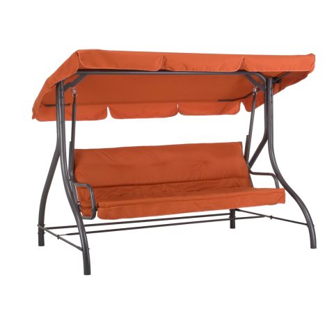 Három személyes hintaágy fix támlával, fém vázzal. Textil ülőfelület, párnákkal, narancs színben. Mérete: 194x120x167 cm. Ülőfelület mérete: 152x48 cm. Teherbírása 260 kg.