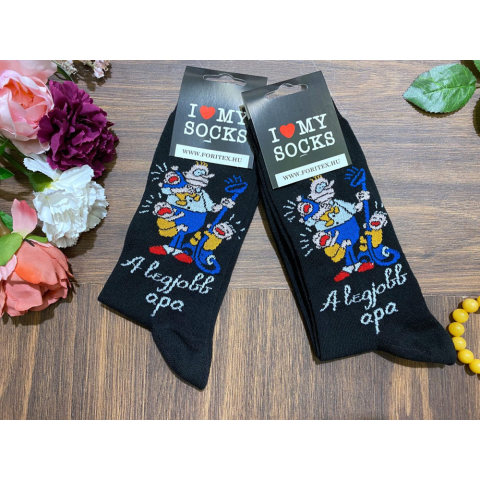 Vicces mintás zokni Legjobb apa zokni. Vicces , egyedi zokni, amelyet csak neked terveztek A termék jellemzői : normál szárú zokni hosszú élettartamú megerősitett orr és sarok kényelmes és rugalmas szár puha , vékony,légáteresztő , jobban felszívja az