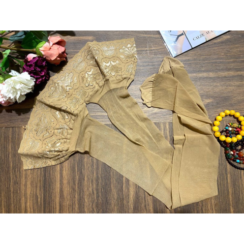 Női combfix Beige. Exkluzív csipke dupla szilikoncsíkkal. Selyemfényű,szilikonos elasztikus átlátszó combfix,10 cm széles csipkével.A csipkében 2 sor szilikoncsíkkal készült A termék jellemzői : hagyományos klasszikus stilus combfix vastag : 20 de