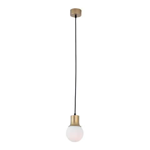 Minimál stílusú függesztett lámpa, fémből készült arany színű foglalattal, melyen egy opál üveggömb található. A lámpa G9 foglalattal, cserélhető fényforrással került kialakításra...
