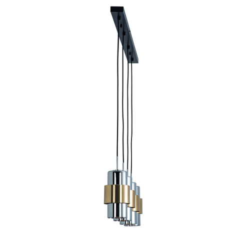 Hengeres formájú, üvegből és fémből készült függesztett lámpa, arany matt árnyékolóval és átlátszó króm üveggel. A lámpa E27 foglalattal, cserélhető fényforrással került kialakításra...