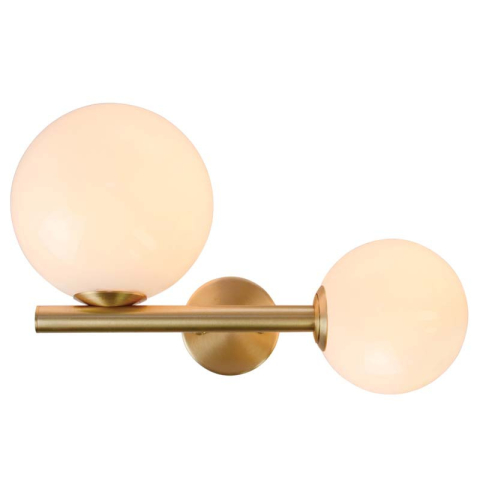 Modern falikar, arany színű fém lámpatesttel, és 2 db gömb alakú opál üvegbúrával. A lámpa falra és mennyezetre is szerelhető...