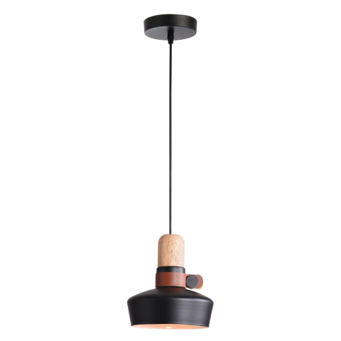 Modern stílusú függesztett lámpa, fém búrával, melyet bőr és fa részletek díszítenek. A lámpa E27 foglalattal, cserélhető fényforrással került kialakításra...