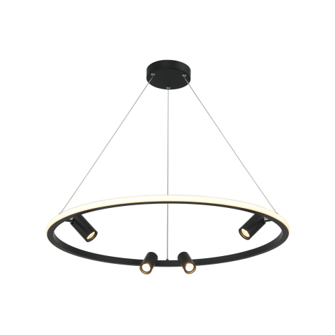 Modern függőlámpa, matt fekete színű kerek fém talppal, akasztós alumínium gyűrűvel, opálfehér szilikon diffúzorral és négy állítható hengeres LED fejjel...