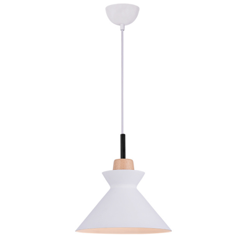 Modern, egyedi kialakítású függesztett lámpa, fém lámpatesttel, kívül zöld, belül fehér alumínium diffúzorral és dekoratív fa elemekkel. A lámpa E27 foglalattal, cserélhető fényforrással került kialakításra...