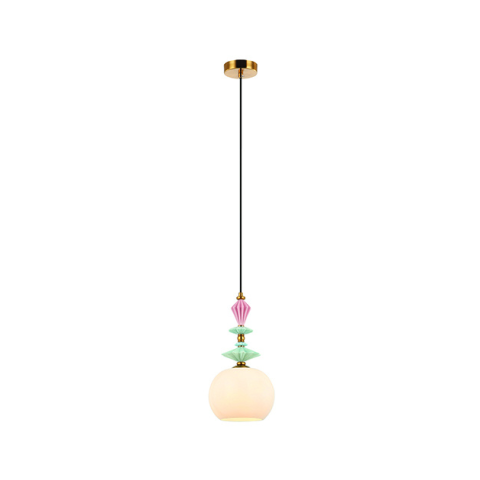 Nagyon különleges kivitelezésű függesztett lámpa. A fekete textil zsinóron lógó színes alakzatokkal díszített kerámia betétek nagyon külünlegessé varázsolják az antik réz lámpatestet, amely egy igényes opál búrában teljesedik ki. A lámpa belógása állíthat..