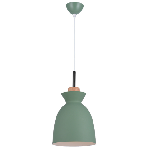 Modern, egyedi kialakítású függesztett lámpa, fém lámpatesttel, kívül zöld, belül fehér alumínium diffúzorral és dekoratív fa elemekkel. A lámpa E27 foglalattal, cserélhető fényforrással került kialakításra...