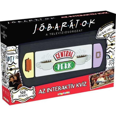 Jóbarátok családi társasjáték különleges, videokazetta formájú konzollal, amin a Central Perk kávézó logója szerepel. Ebben az interaktív kvíz társasjátékban most ti is kipróbálhatjátok tudásotokat a népszerű sorozattal kapcsolatosan. 500 kérdés vár megvá