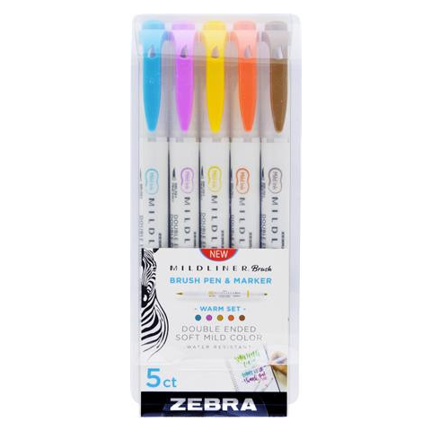 Ecsetirón készlet, kétvégű ZEBRA Mildliner Warm, 5 szín A Mildliner termékcsaládunk a legkedveltebb a kreatív alkotók körében. A Mildliner Brush&Marker kettős végű kialakításának köszönhetően remekül ötvözi a kreatív ecsetfilc és a magabiztos kerek heg