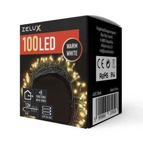 Varázsoljon meghitt, karácsonyi hangulatot, az alacsony fogyasztású, hosszú élettartamú Zelux karácsonyfa füzéreivel. A 12 méter hosszú füzéren 100 darab LED található, ami egyaránt alkalmas kül- és beltéri használatra is. 3 darab AA elemmel működik,