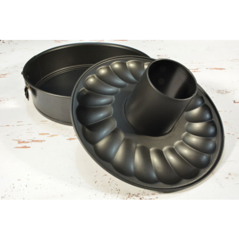 Kapcsos tortaforma kivehető aljjal amihez tartozik egy széles kuglóf betét forma