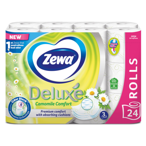 Zewa Deluxe Camomile Comfort: üde zöld dombornyomású, 3 rétegű toalettpapír a kamilla kellemes illatával. Az első Zewa toalettpapír a fürdőszobai kellemetlen szagok semlegesítéséért és a kellemes illatokért! Új Odor Block technológia szagsemlegesítő hatás