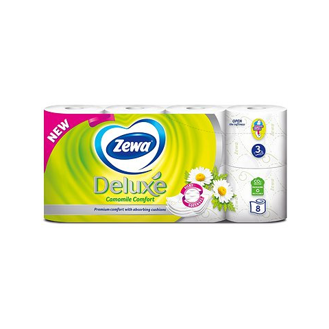 A Zewa Deluxe Camomile, 3 rétegű toalettpapír. Az extra kényeztetés érdekében enyhe kamilla illatot áraszt magából. Ez a fehér wc papír gyengéd puhasággal biztosítja bőrének az alapvető gondoskodást. A dombornyomású Zewa-embléma pedig elismert minőségük g