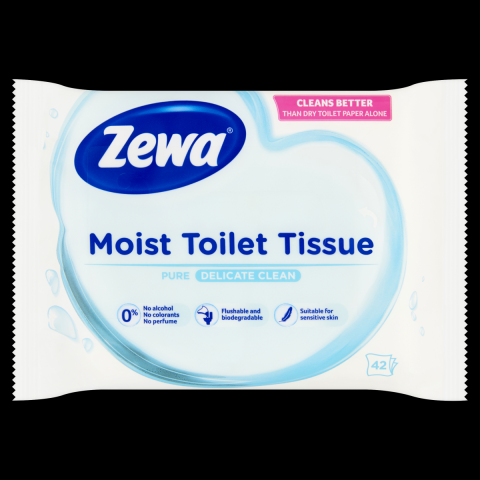 Nedves wc papír - illatmentes, érzékeny bőrre, lezárás öntapadó szalaggal, lap hossza 19 cm, lap szélessége 11,5 cm, 42 darab a csomagban A ZEWA Moist Pure nedves toalettpapír a megbízható tisztasághoz adalékok nélkül. Ez a WC papír parfümmentes és semleges pH értékkel rendelkezik. Ezenkívül leöblíthető és biológiailag lebomlik. Nagy el