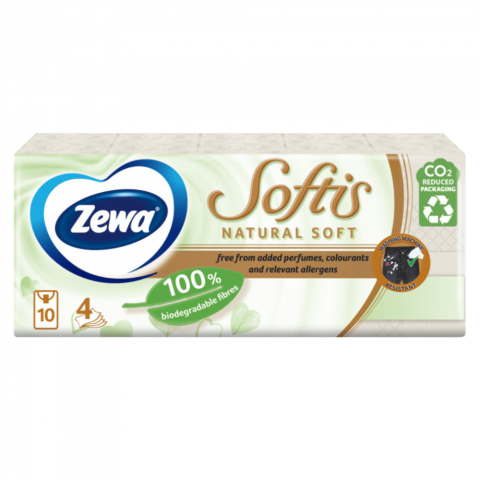Zewa Natural Soft 10x9 db. illatmentes, 4 rétegű papírzsebkendő, mely nem csak a bőrhöz, hanem a környezettel is kíméletes. Hozzáadott színezék-, illatanyag- és allergénmentes és ellenáll a mosásnak. Zewa Softis Natural Soft 4 rétegű papírzsebkendő (10